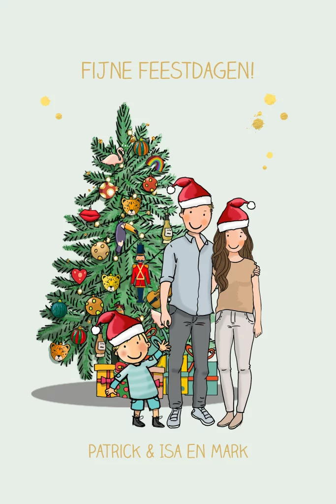 Kerstkaart familie met kerstboom, deze kaart is geheel naar wens samen te stellen. Alle illustraties zijn los.