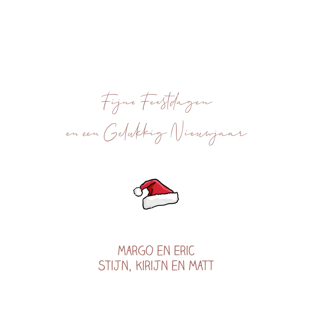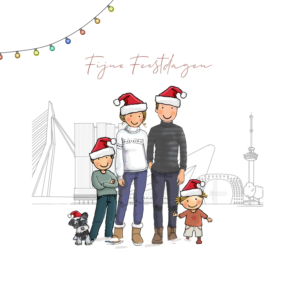 Mooi getekende kerstkaart met familie en hondje. Op de achtergrond Rotterdam, in de clipart staan veel verschillende steden en dorpen, zo kun je helemaal naar wens je kaart samenstellen.