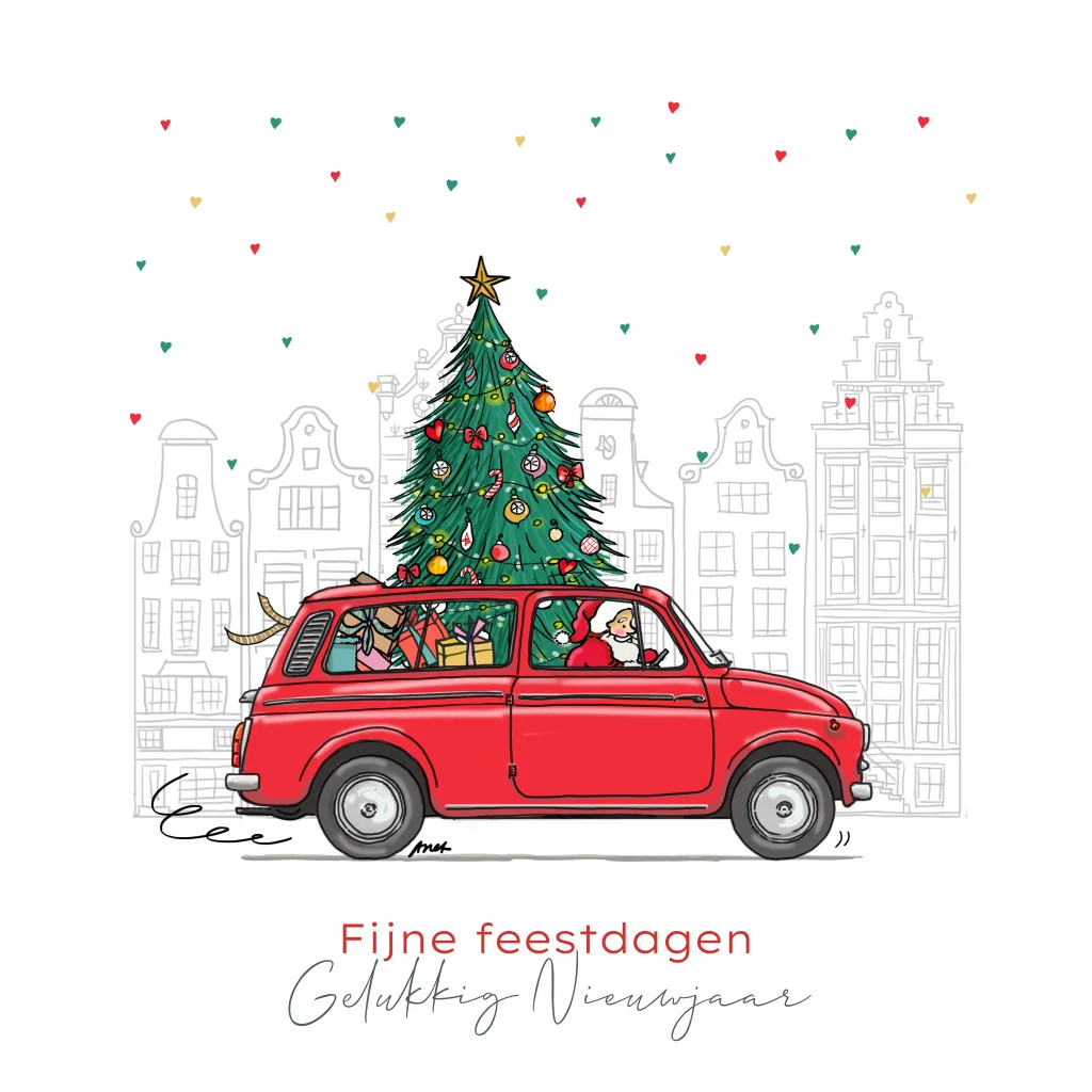 Kerstkaart Fiat 500 rood bestel met kerstboom