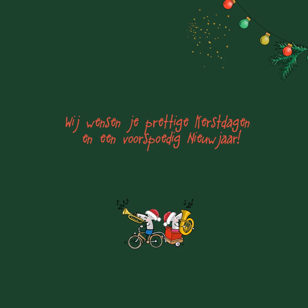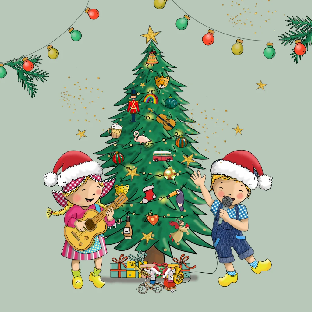 Kerstkaart Fien en teun met kerstboom en gitaar