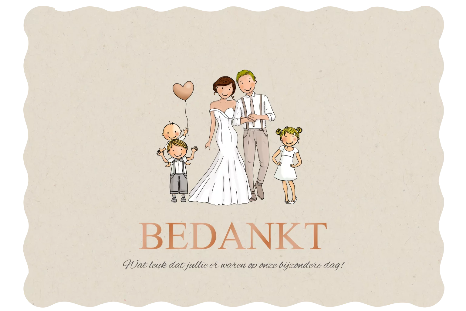 Bedankkaart getekende bruidspaar met kinderen en ballon