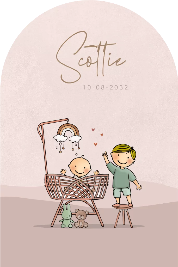 Nieuw in ons aanbod: de boogkaart kindje in rotan wiegje met broertje. Dit unieke geboortekaartje is getekend en stansvormig, wat het extra lief en origineel maakt. Het kaartje is kleurrijk en vrolijk, volgens de laatste trend kleuren, met een rotan wiegje en broertje.
