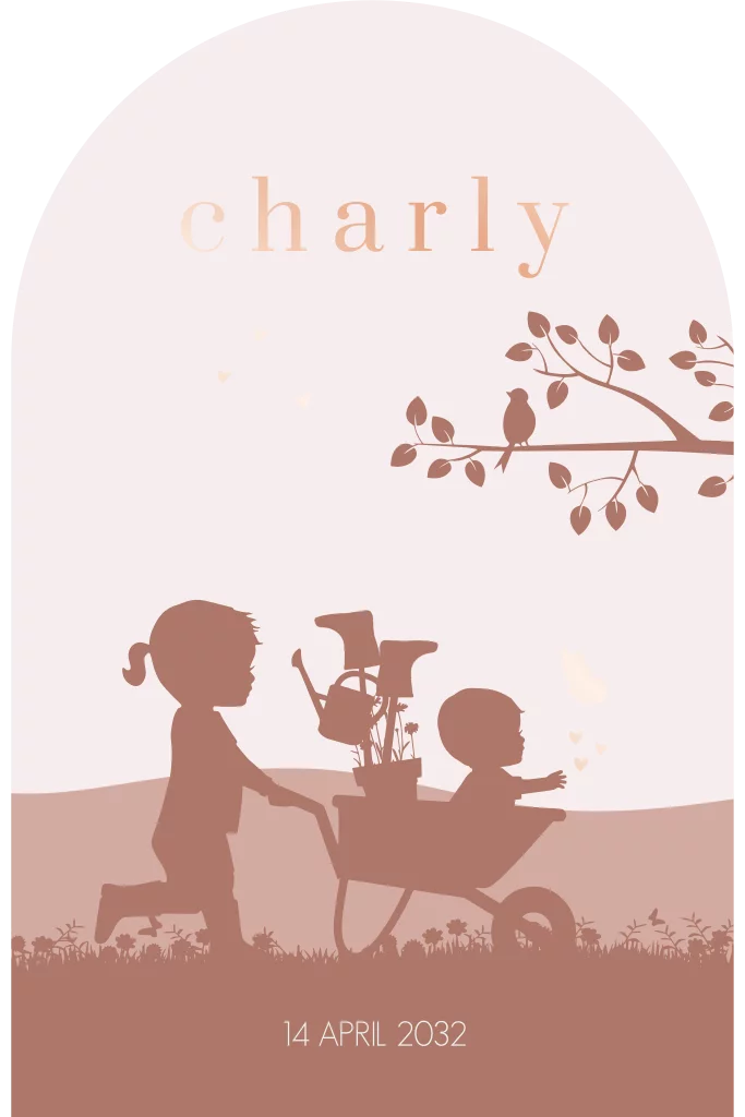 Dit is een uniek kaartje voor jullie pasgeboren dochter. Het kaartje heeft de vorm van een arch. Stoer zusje met baby meisje in kruiwagen met gieter en laarsjes. De goudfolie details zijn prachtig.