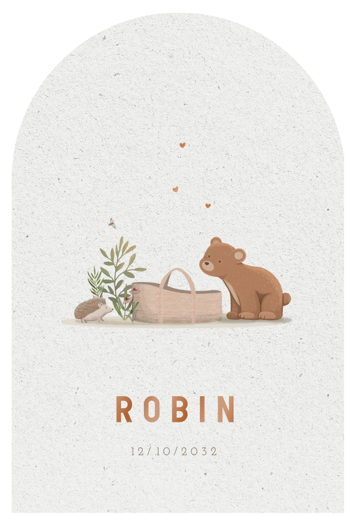 Super lief en schattig boog kaart geboortekaartje van een kleine beer die in het mandje kijkt, lieve egel met takjes en hartjes maken het kaartje helemaal af.