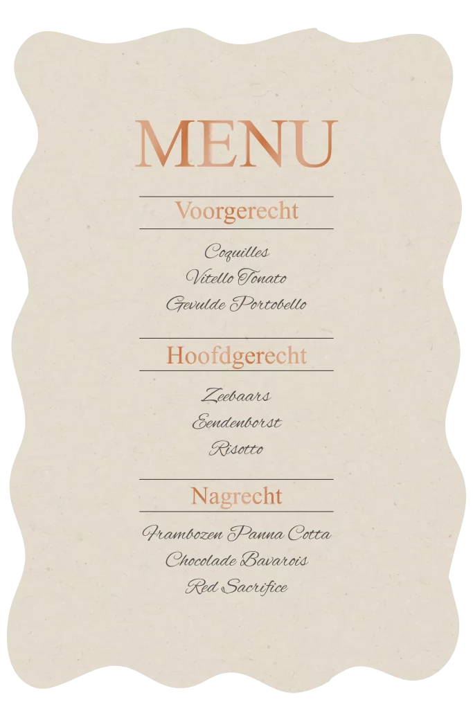 Menukaart bruinfolie luxe is een chique menukaart met een leuke kartelrand. Deze kaart past perfect bij de huisstijl van de trouwkaart getekende bruidspaar met kinderen en is compleet aanpasbaar.