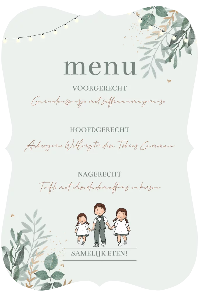 Menukaart takjes met lichtjes prikkabel. Deze menukaart is compleet aanpasbaar en past perfect bij de huisstijl van de trouwkaart illustratie van gezin met hartjes en groen.