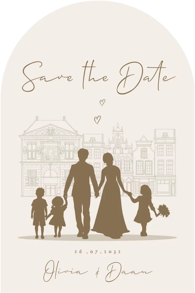 Deze mooie save the date kaart heeft een strakke illustratie van een stad en een bruidspaar als silhouet. Dit bruidspaar loopt mooi hand in hand met kinderen. De kaart past mooi bij de huisstijl van de trouwkaart hand in hand met kinderen en boeket.