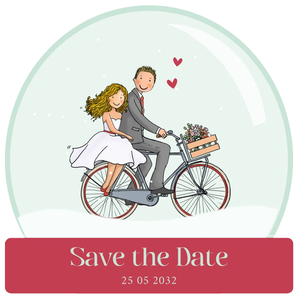 Save the Date en kerstkaart bijzondere vorm sneeuwbol met fietsende bruidspaar