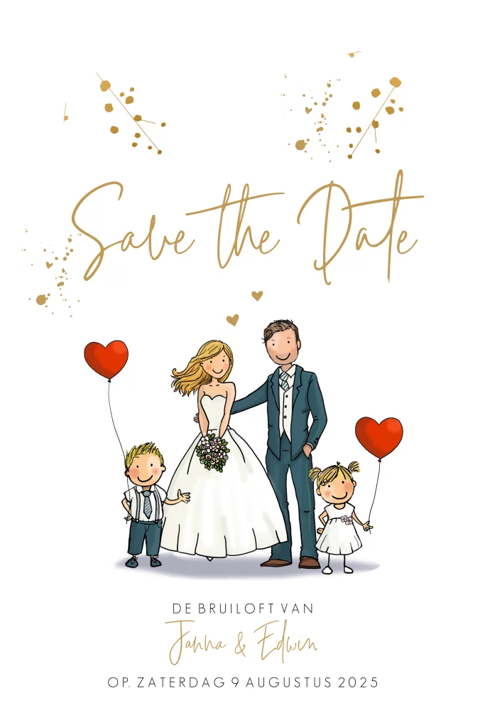Save the date kaart bruidspaar met kinderen en rode ballonnen. Het is vrolijk getekend met leuke kleine hartjes en een glitterlook erbij.