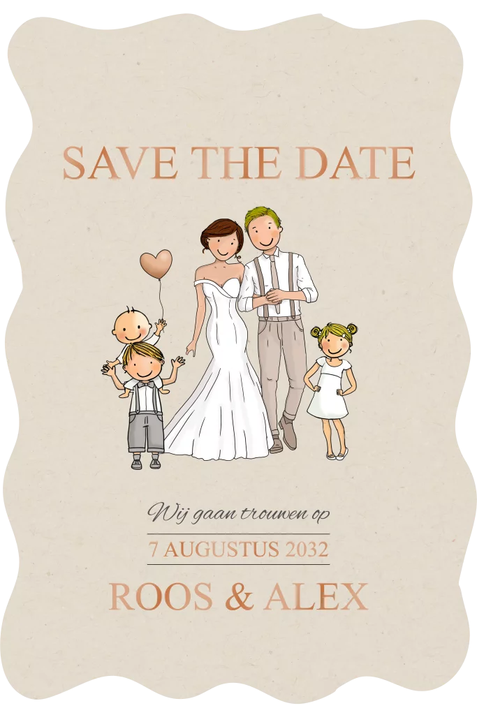Savethedate getekende bruidspaar met kinderen en ballon is een chique en vrolijke met folie kaart. Deze save the date kaart past perfect bij de huisstijl van de trouwkaart getekende bruidspaar met kinderen en ballon, maar je kan de kaart ook nog helemaal aanpassen naar jouw voorkeur.