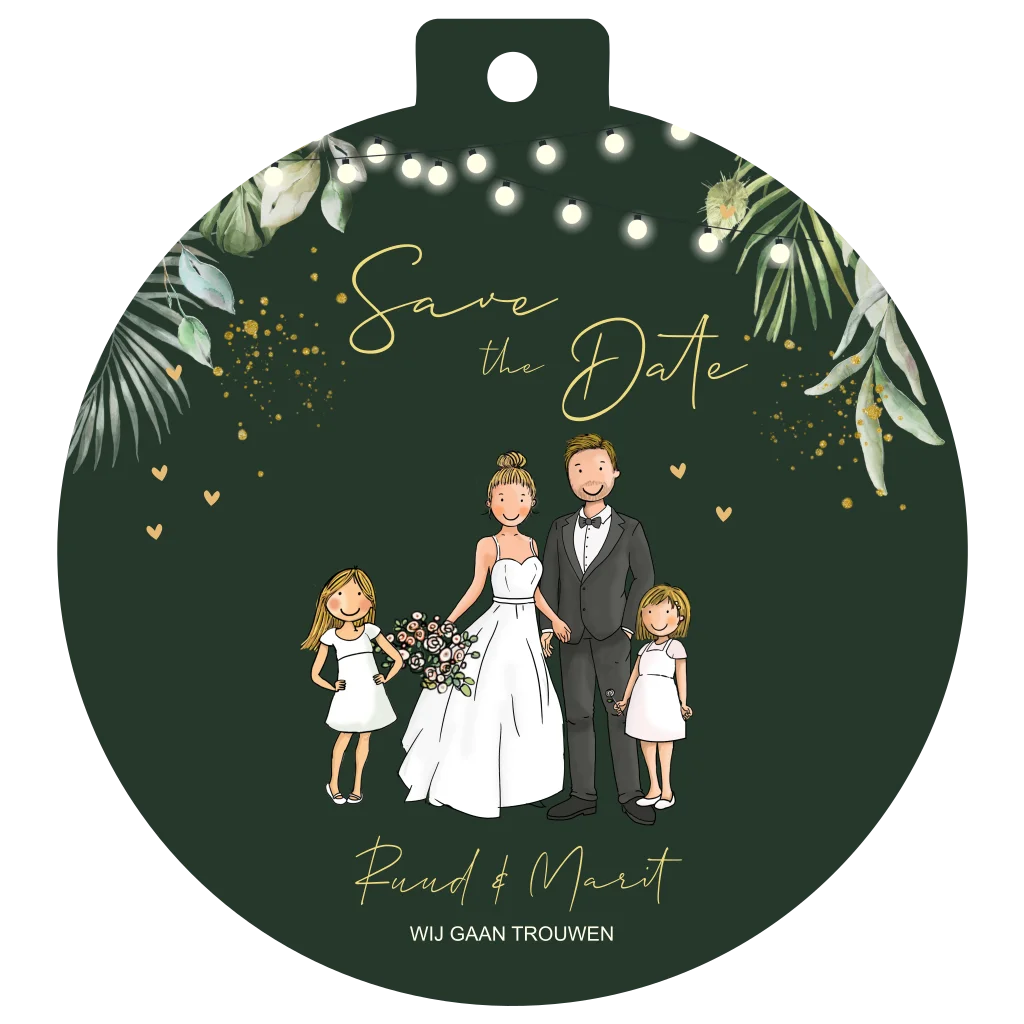 Savethedate priklampjes in kerstbal vorm met bruidspaar