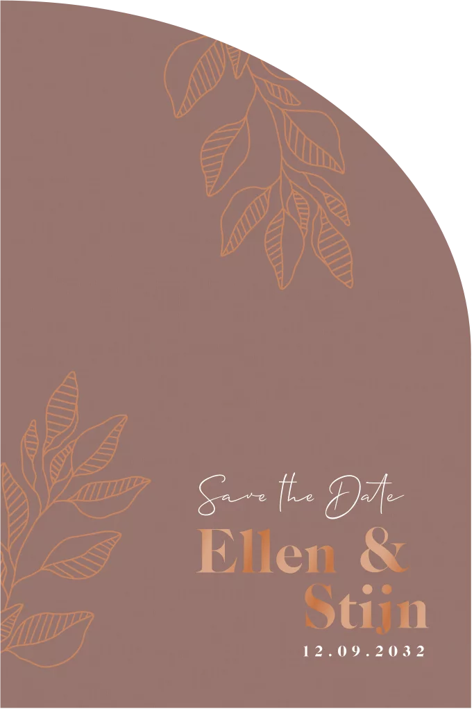 Als je op zoek bent naar iets unieks voor je savethedate, dan is deze prachtige trouwkaart met takjes en goudfolie zeker iets voor jou! Deze kaart is perfect voor een botanische of natuurlijke bruiloft. De kraftkleurige basis maakt het design rustig en stijlvol, terwijl de rosegouden foliedetails het geheel een luxe uitstraling geven.