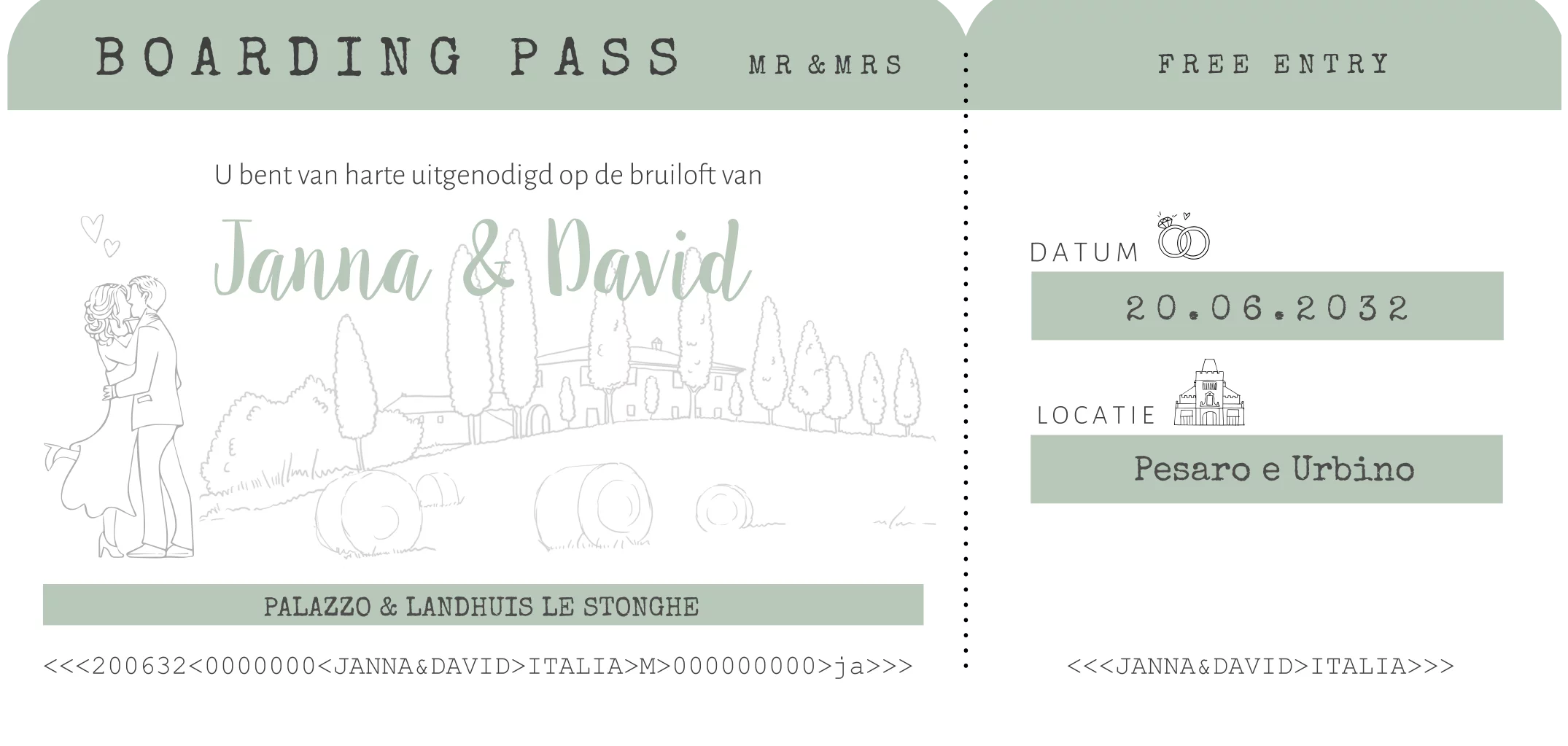 Ticket vorm trouwkaart groen met illustraties, de achtergrond illustratie is naar wens aanpasbaar met een andere locatie. In de clipart staan diverse leuke steden. Teksten en kleuren zijn ook aanpasbaar.