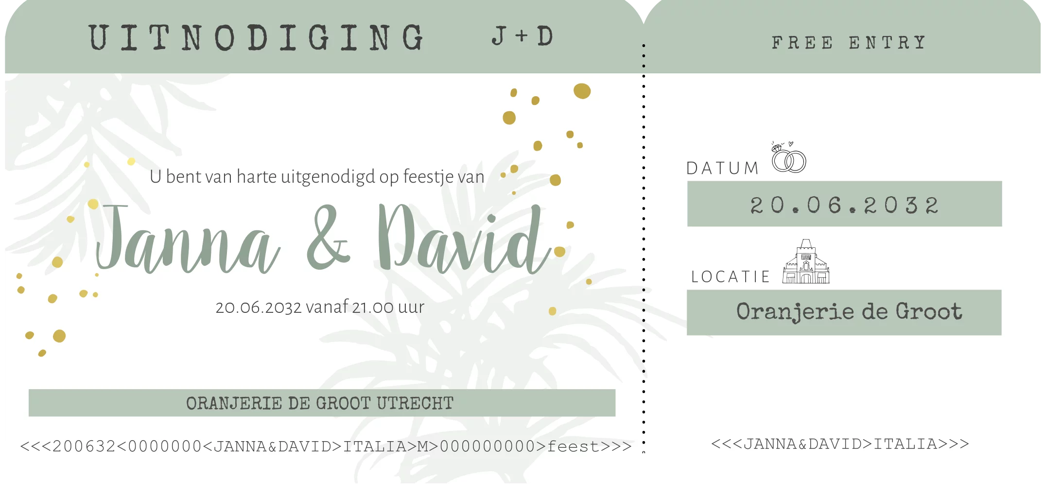Ticket vorm uitnodiging groen met illustraties, de achtergrond illustratie is naar wens aanpasbaar met een andere locatie. In de clipart staan diverse leuke steden. Teksten en kleuren zijn ook aanpasbaar.