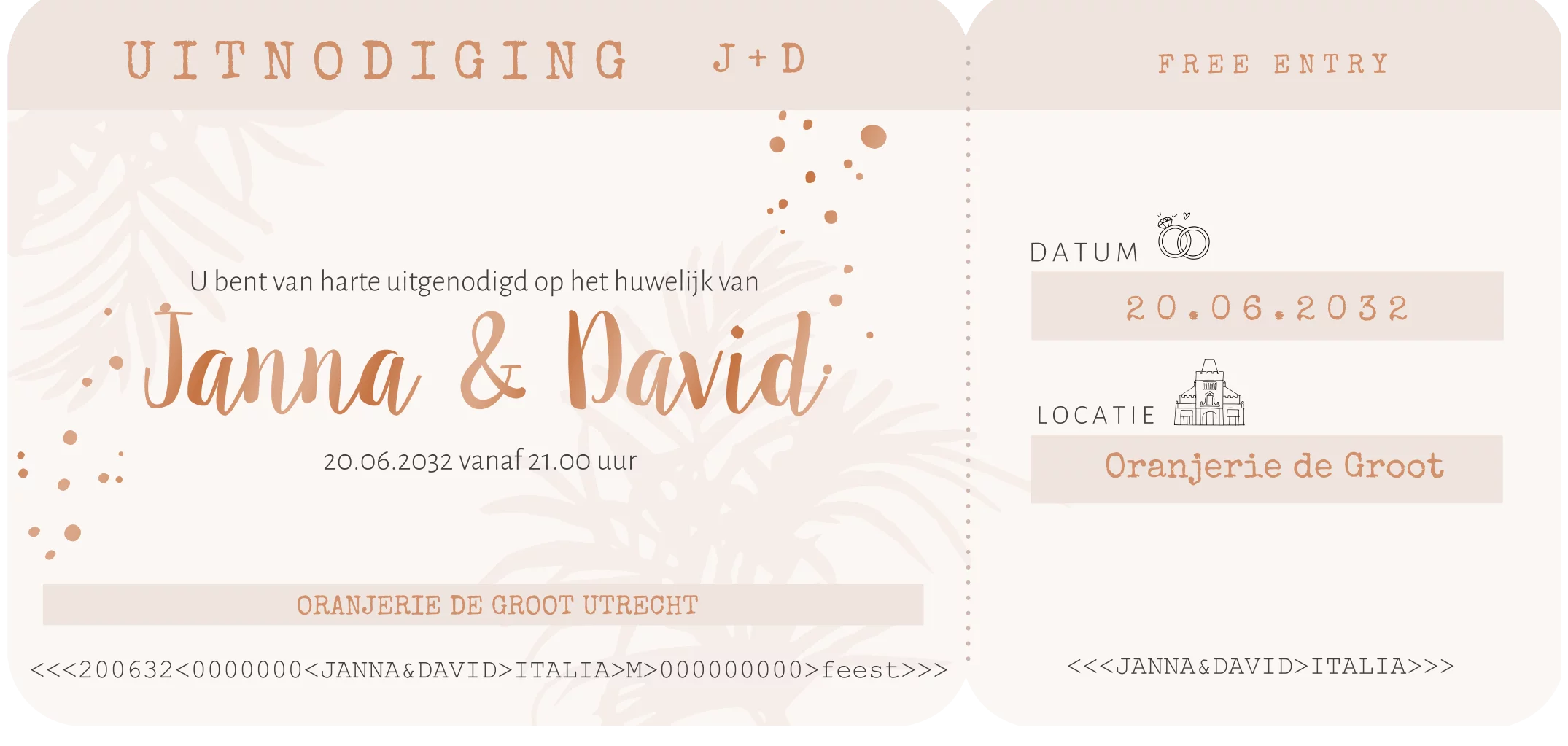 Ticket vorm uitnodiging trouwen met illustraties stans