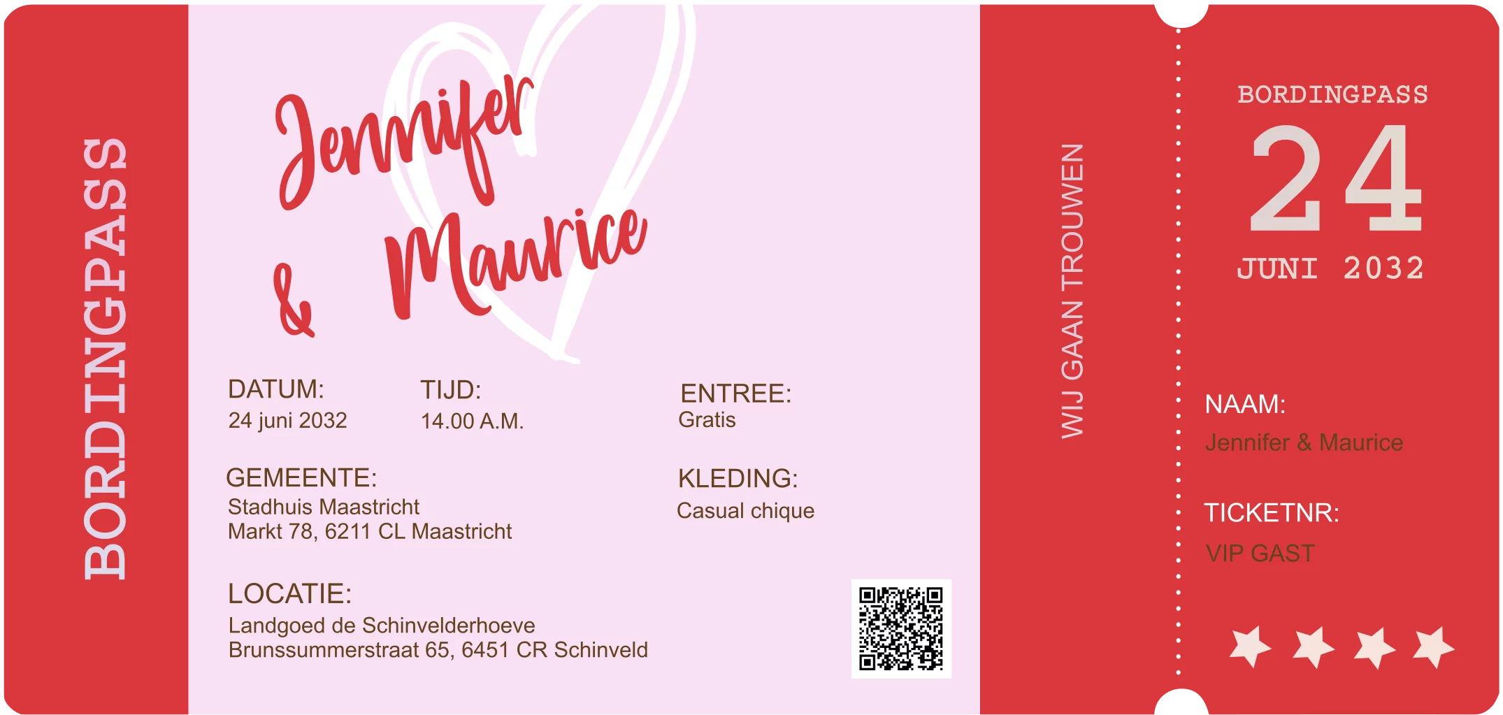 Ticketvorm rood roze in holografische folie is een uniek en modern product dat perfect is voor een bruiloft of andere speciale gelegenheid. Het ticket is bedrukt met holografische folie, waardoor het holografisch effect ontstaat. Dit maakt het ticket echt uniek en een echte eye-catcher!