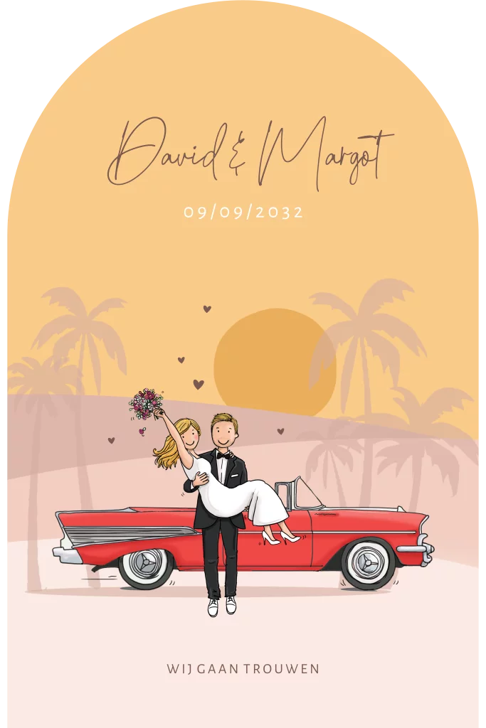 Trouwkaart bruidspaar met Chevrolet Bell air cabrio rood. Een unieke trouwkaart voor een uniek bruidspaar! Deze kaart is getekend met een Chevrolet bell air cabrio, de auto en bruidspaar zijn te vervangen uit afbeeldingen uit de clipart. Laat je creativiteit de vrije loop en ontwerp je eigen unieke trouwkaart.