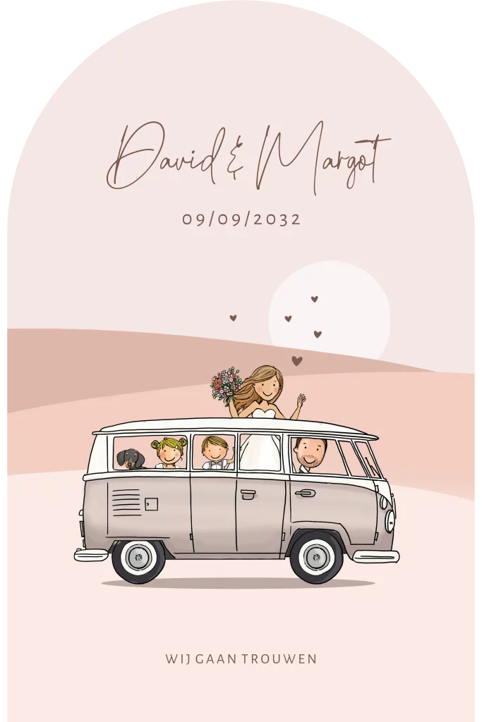 Trouwkaart bruidspaar met vwbus beige met landschap - Een unieke trouwkaart met een romantisch tintje! Dit ontwerp is perfect voor een paar dat op zoek is naar een originele en bijzondere trouwkaart. Het beige VW-busje maakt het ontwerp helemaal af en geeft het een vintage uitstraling. De bloemen en hartjes in het ontwerp maken het geheel romantisch en uniek.