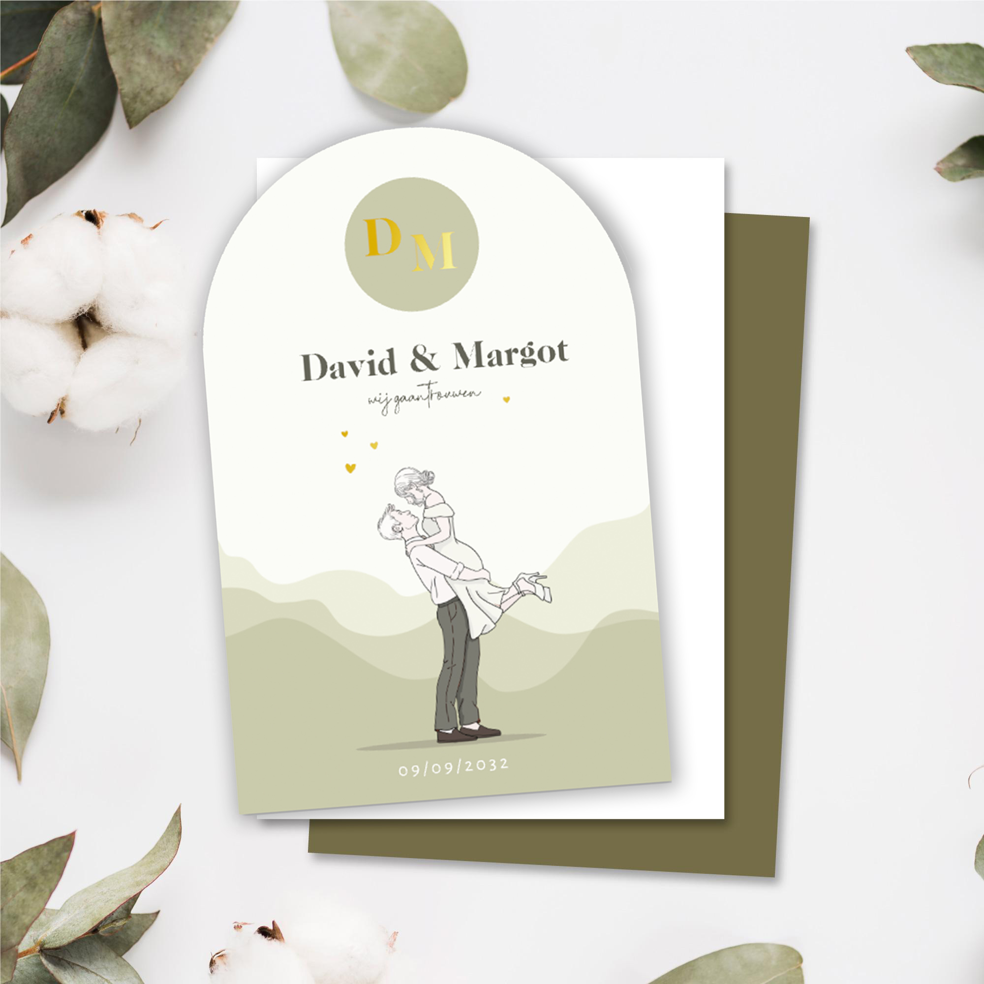 Trouwkaart bruidspaar optillen met groene tinten