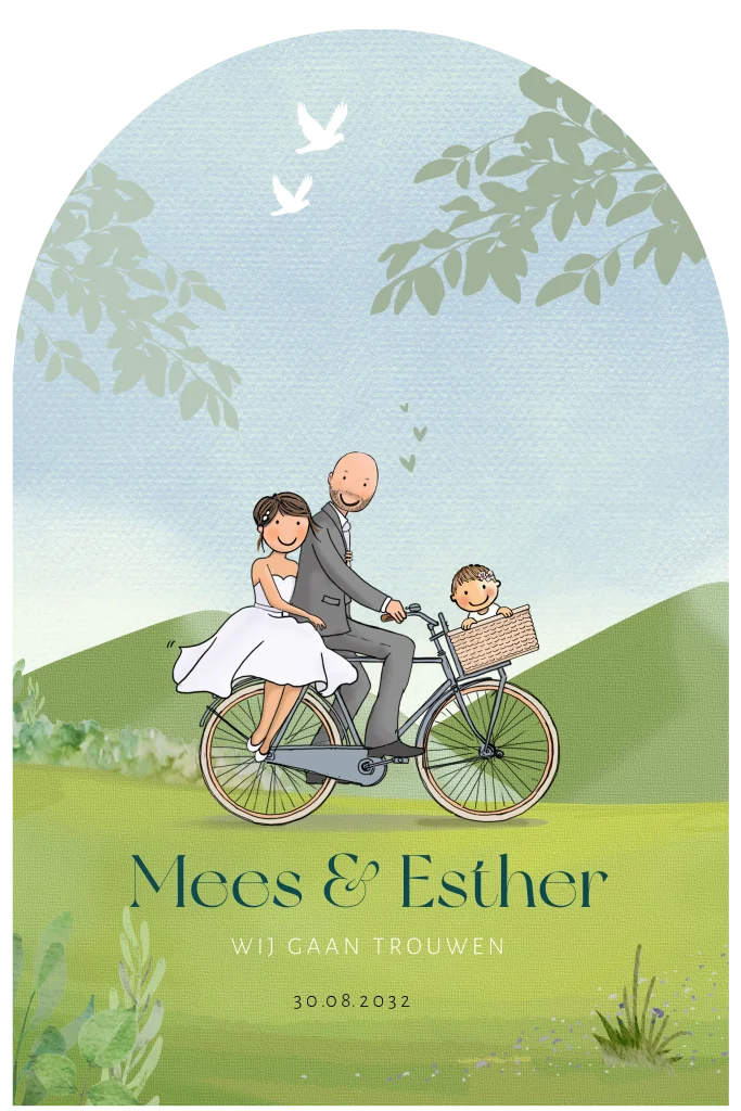 Trouwkaart landschap ronde boog met bruidspaar op fiets en kindje. Mocht je een andere samenstelling willen, in de clipart staan veel losse varianten klaar bij mapje trouwen tweewielers. Ook kunnen we de kaart voor je aanpassen naar je wensen.