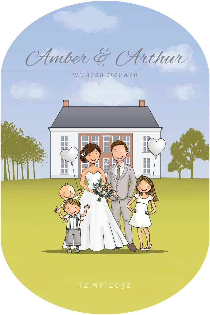 Trouwkaart stansvorm familie met kleurrijke achtergrond. De poppetjes zijn naar wens aanpasbaar. In de clipart staan veel leuke varianten. Veel plezier met het ontwerpen!
