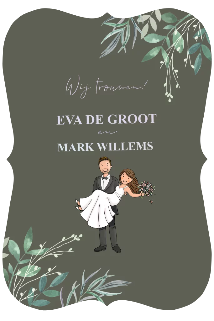 Trouwkaart in een prachtige unieke vorm met bruidspaar en takjes en hippe folie opdruk.