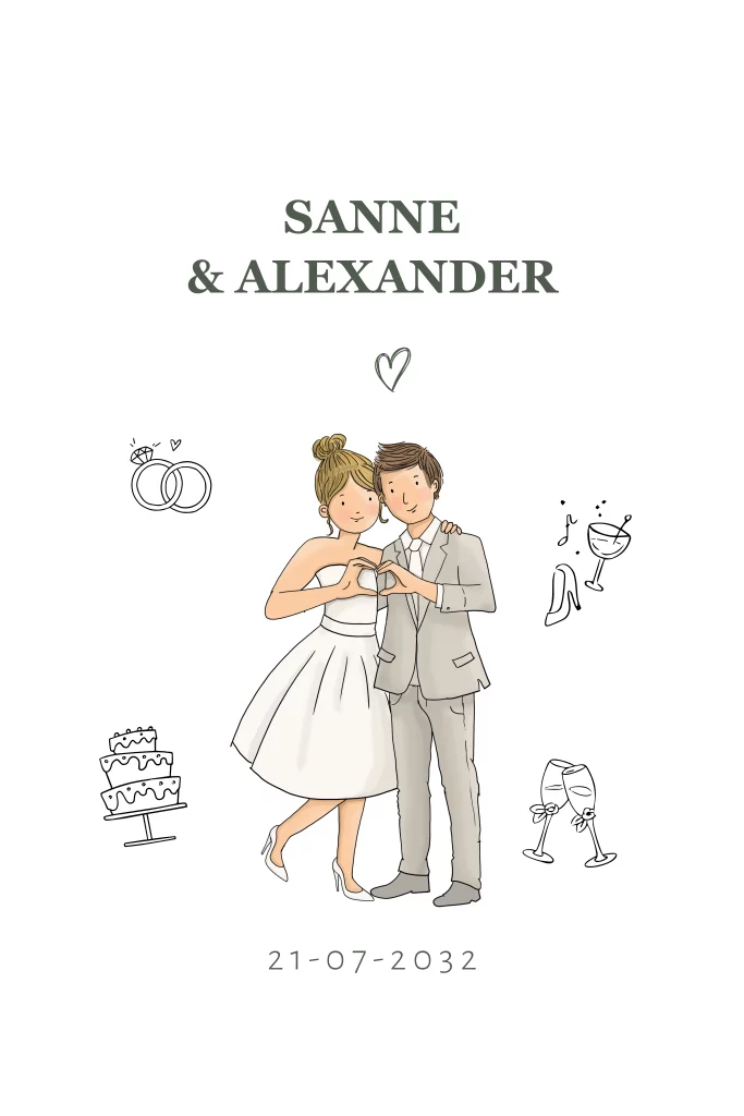 Onze prachtige trouwkaart vorm met bruidspaar hart handen is een unieke en eigentijdse keuze voor stellen die op zoek zijn naar een bijzondere aankondiging van hun speciale dag. De illustratieve afbeelding van het bruidspaar met een hartje in hun handen straalt liefde en originaliteit uit, waardoor deze kaart perfect is om de toon te zetten voor jullie bruiloft.