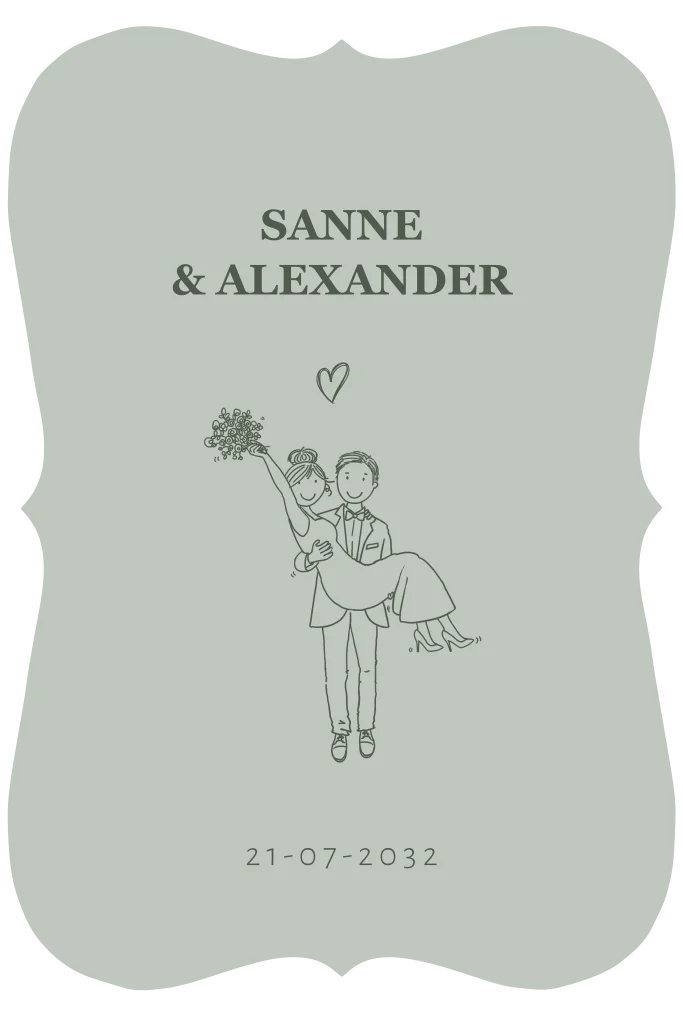 Trouwkaart in een prachtige unieke vorm met bruidspaar pentekening. Een bijzonder en eigentijdse trouwkaart. Vragen, laat gerust weten.