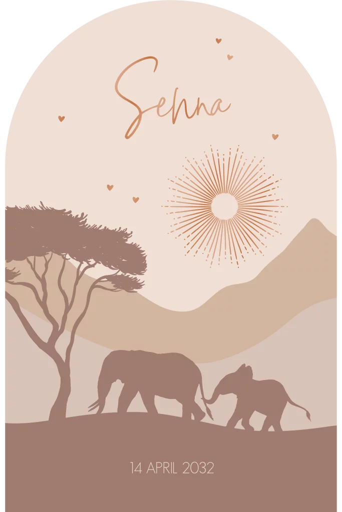 Dit is een uniek kaartje voor jullie pasgeboren dochter. Het kaartje heeft de vorm van een arch. Op het kaartje staat een abstract landschap met de silhouetten van twee olifantjes. De koperfolie details zijn prachtig.