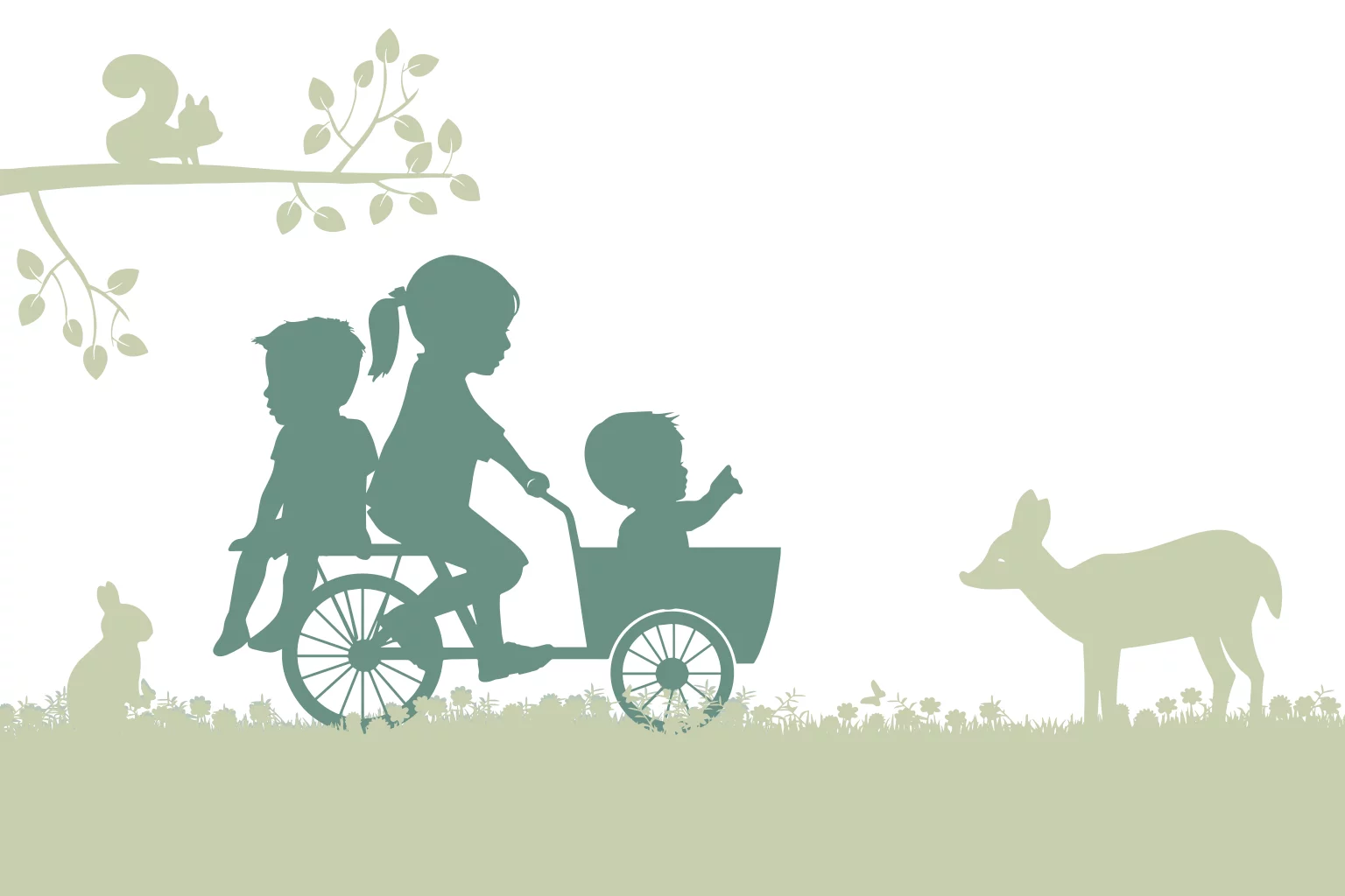 Geboortekaartje jongen stanskaart, zus fietst op leuke bakfiets met broertjes, eekhoorn, ree en konijn maken het geheel af. Wat een vrolijke kaart. Door de ronde stansvorm is deze extra bijzonder.