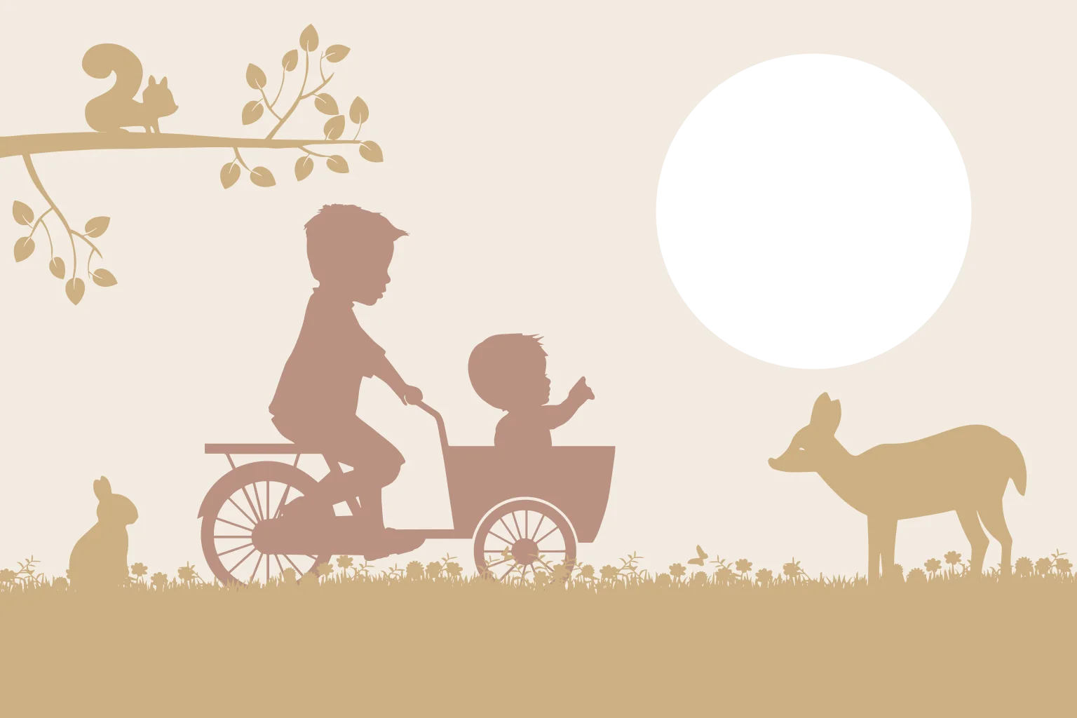 Geboortekaartje meisje stanskaart, broer fietst op leuke bakfiets met zusje, eekhoorn, ree en konijn maken het geheel af. Wat een vrolijke kaart. Door de ronde stansvorm is deze extra bijzonder.