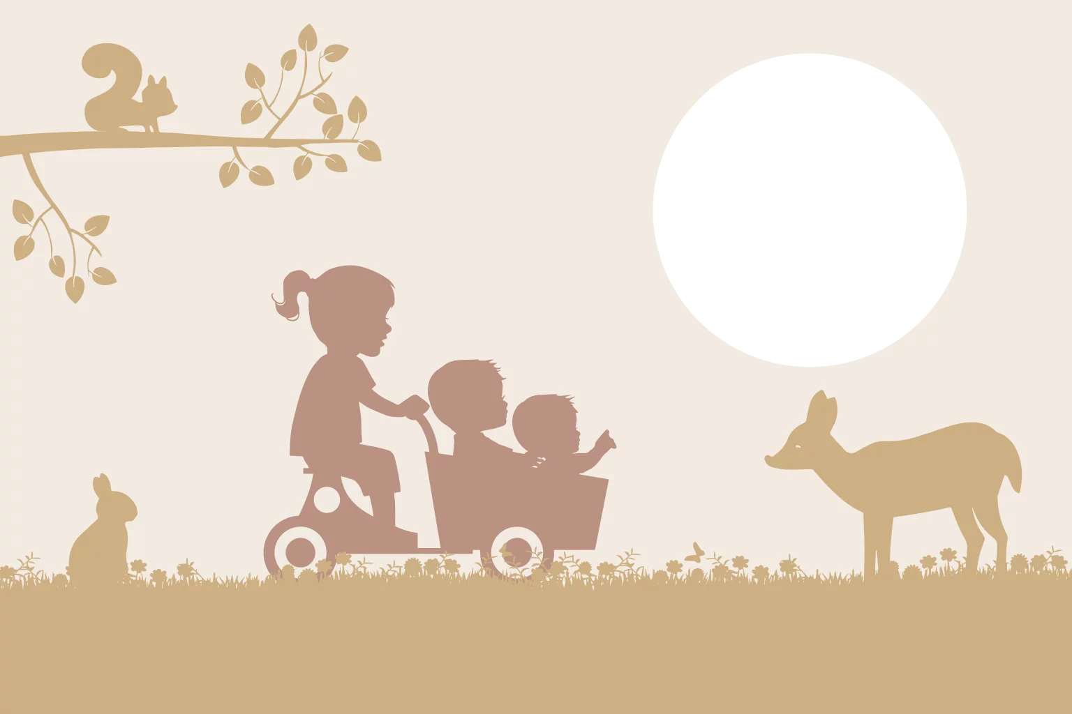 Geboortekaartje meisje stanskaart, zus fietst op leuke bakfiets met broer en zusje, eekhoorn, ree en konijn maken het geheel af. Wat een vrolijke kaart. Door de ronde stansvorm is deze extra bijzonder.
