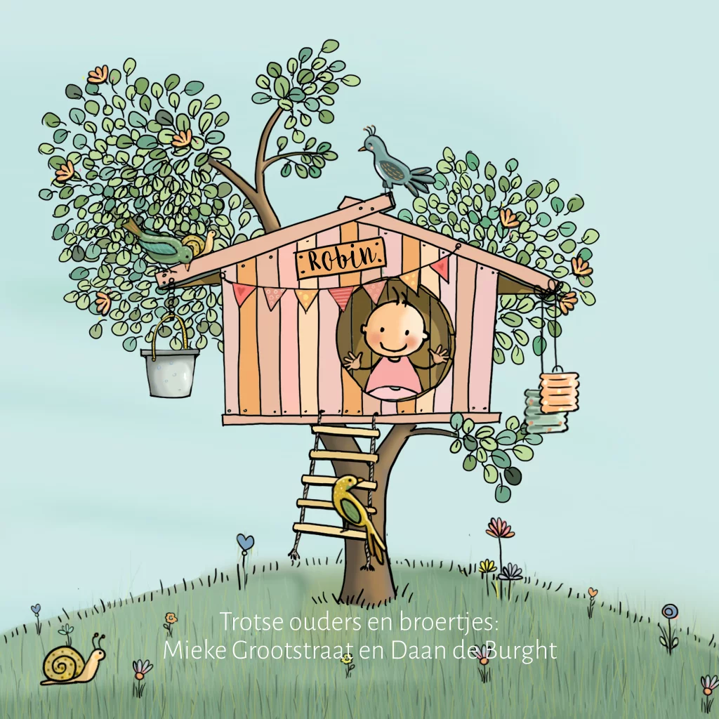 Geboortekaartjes meisje met broertjes boomhut met vogels ronde stans