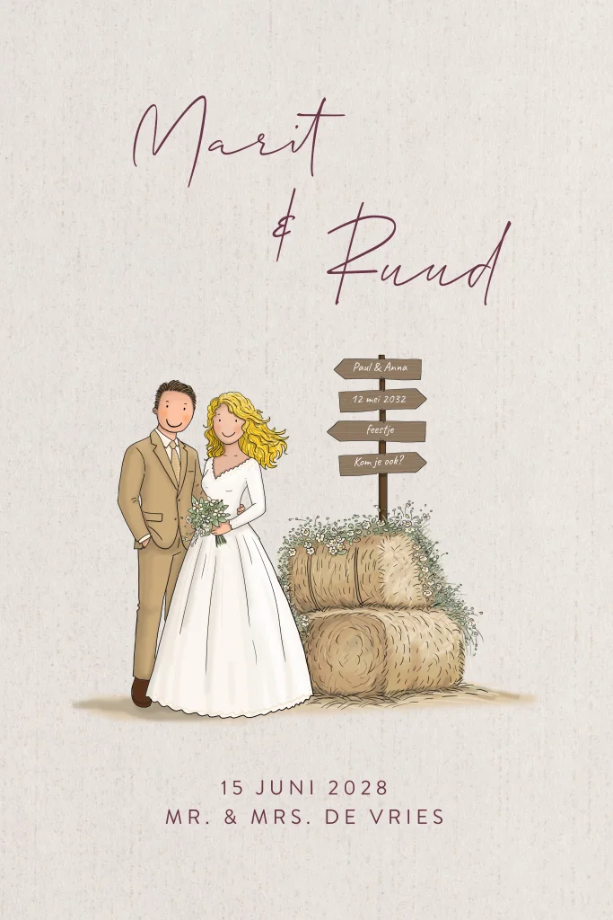 Trouwkaart bruidspaar met hooi en bordjes