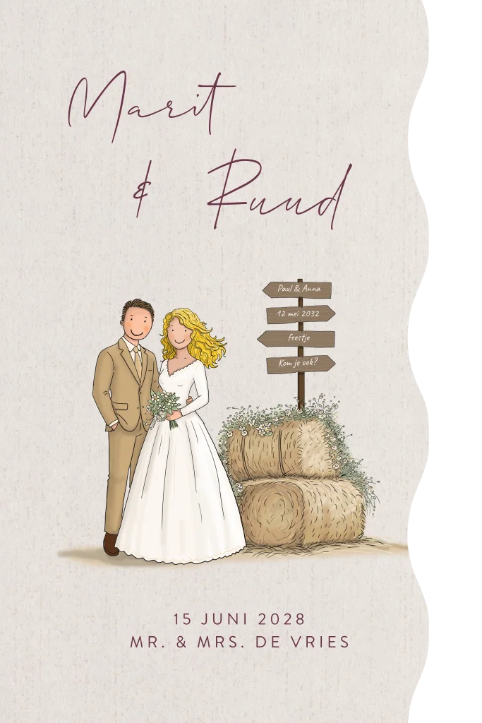 Mooie vorm dubbel trouwkaart met bruidspaar en hooi met bordjes. Wil je een andere vorm, kleur of bruidspaar, laat gerust weten, we passen het voor je aan.