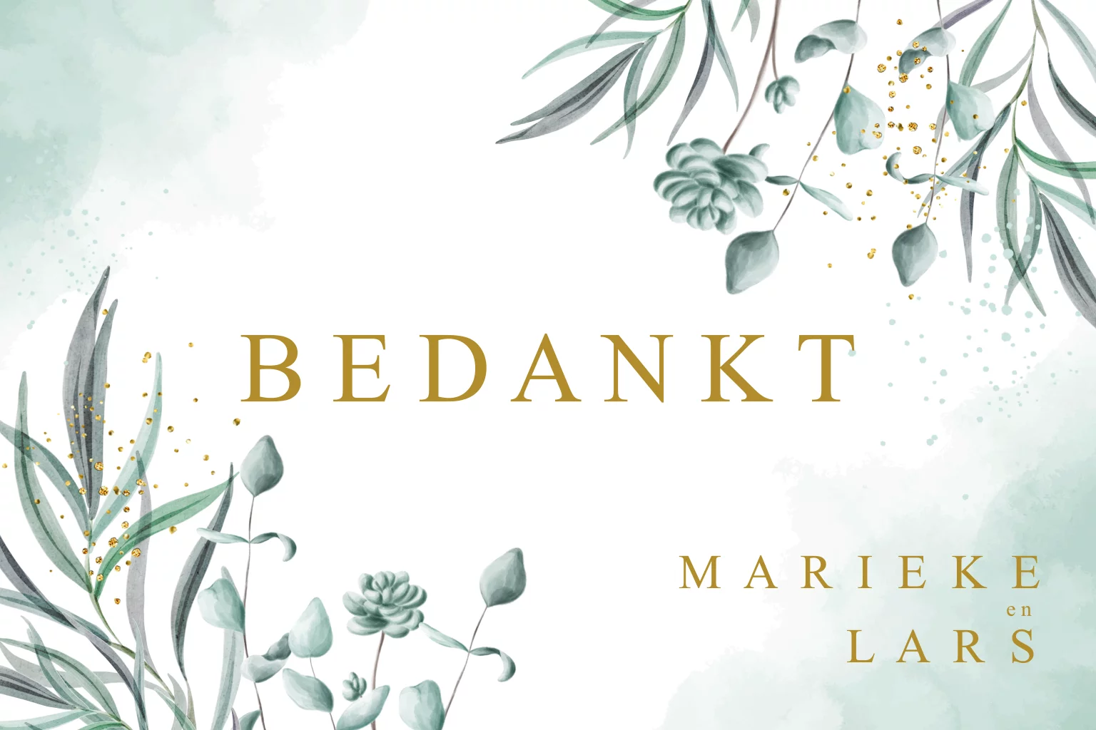 Bedankkaart eucalyptus bladeren, een unieke en stijlvolle bedankkaart voor een bijzondere gelegenheid! Deze bedankkaart is ontworpen met prachtige eucalyptusblaadjes en goudfolie. Het is een uniek en tijdloos ontwerp dat perfect is voor een bruiloft, verjaardag of andere speciale gelegenheid.