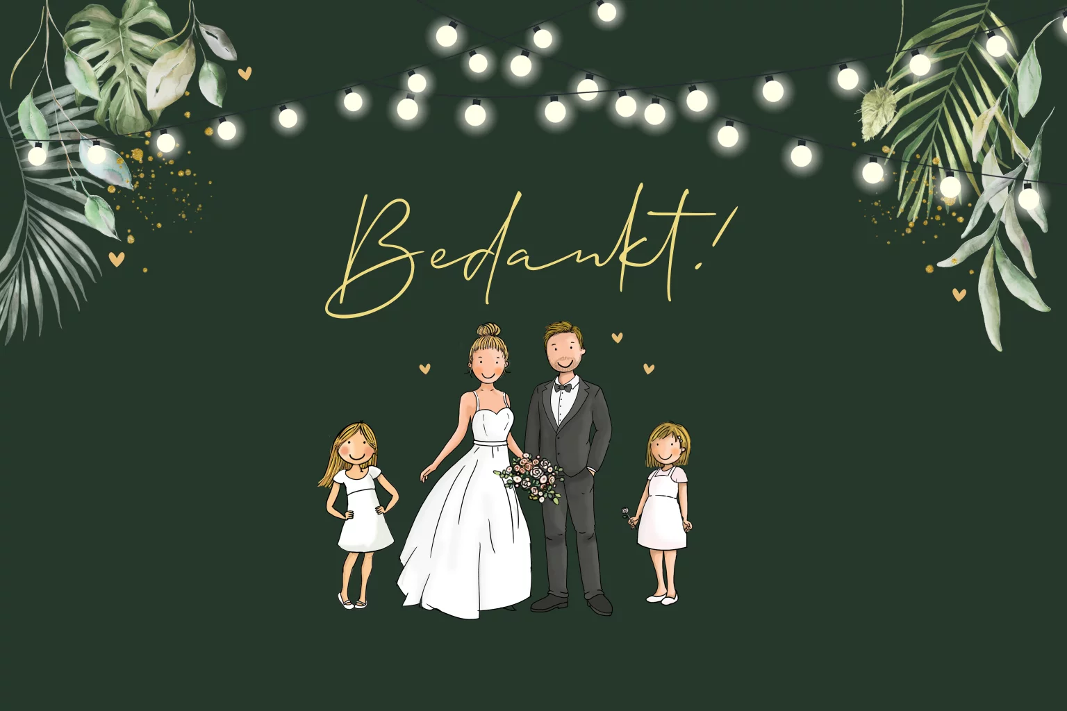 Bedankkaart priklampjes met groene takjes en bruidspaar is een vrolijke strakke bedankkaart, perfect passend bij de huisstijl van de uitnodiging trouwkaart priklampjes met groene takjes en bruidspaar. De kaart is volledig aanpasbaar naar jouw wensen.