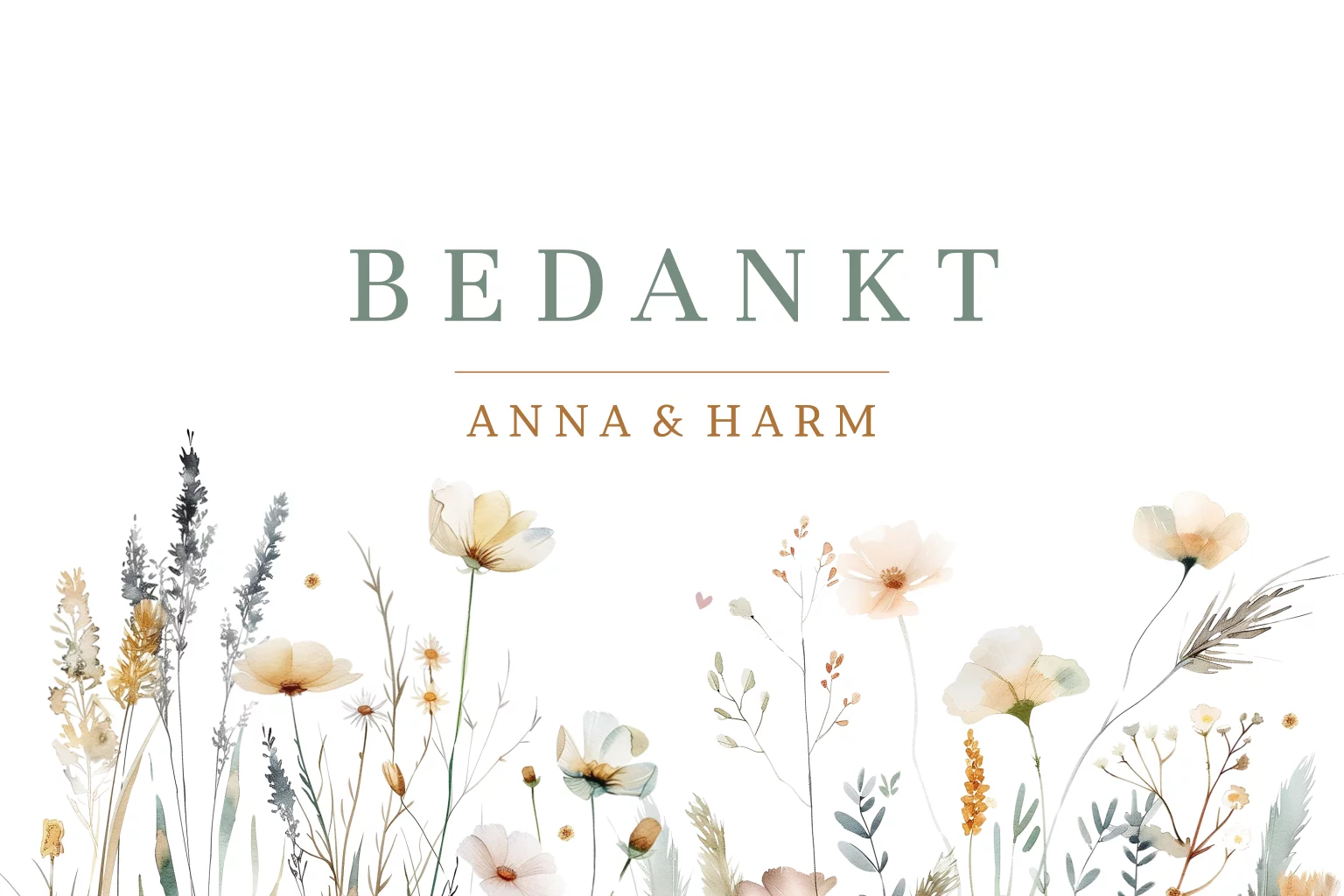 Bedankkaart veldbloemen met hartjes. Dit bedankkaartje is perfect om te gebruiken als bedankje voor je vrienden, familie of geliefden. Het kaartje is gemaakt van hoogwaardig karton en afgewerkt met mooie veldbloemen met hartjes. Het kaartje is blank inside zodat je je eigen boodschap kan toevoegen. Deze bedankkaart past perfect bij de huisstijl van de trouwkaart veldbloemen met zachte kleuren.