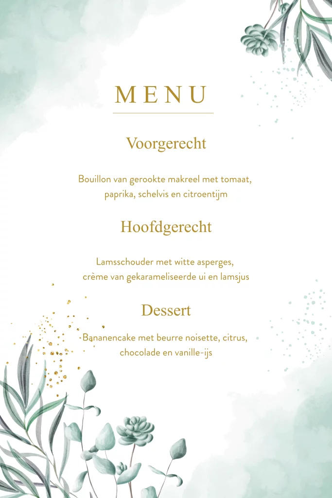 Hou je van een stijlvolle menukaart met een botanische twist? Dan is deze menukaart met eucalyptus takjes en goudlook echt iets voor jou! De kleuren groen en blauw staan prachtig afgebeeld in een watercolour stijl en geven de menukaart een chique uitstraling.