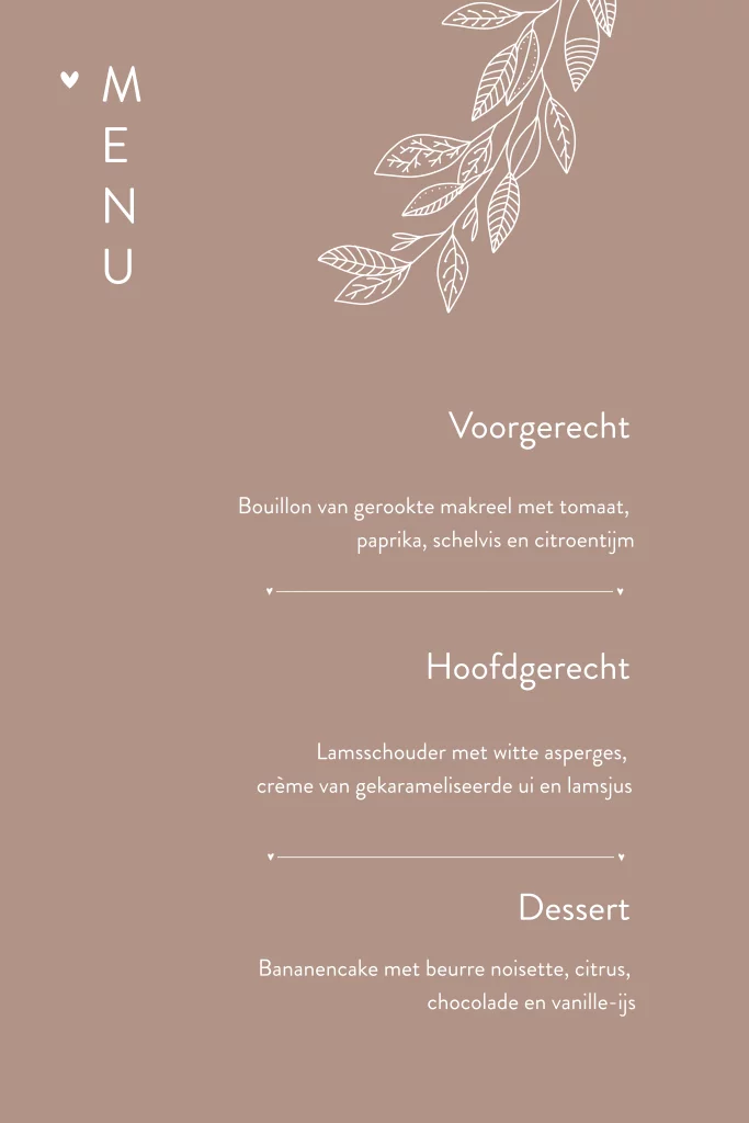 Een strakke menukaart met takjes en een mooie hippe achtergrond is een perfecte keuze voor een bruiloft. De kaart is eenvoudig maar stijlvol en heeft een unieke strakke stijl. De menukaart is langwerpig en past perfect bij elk seizoen.