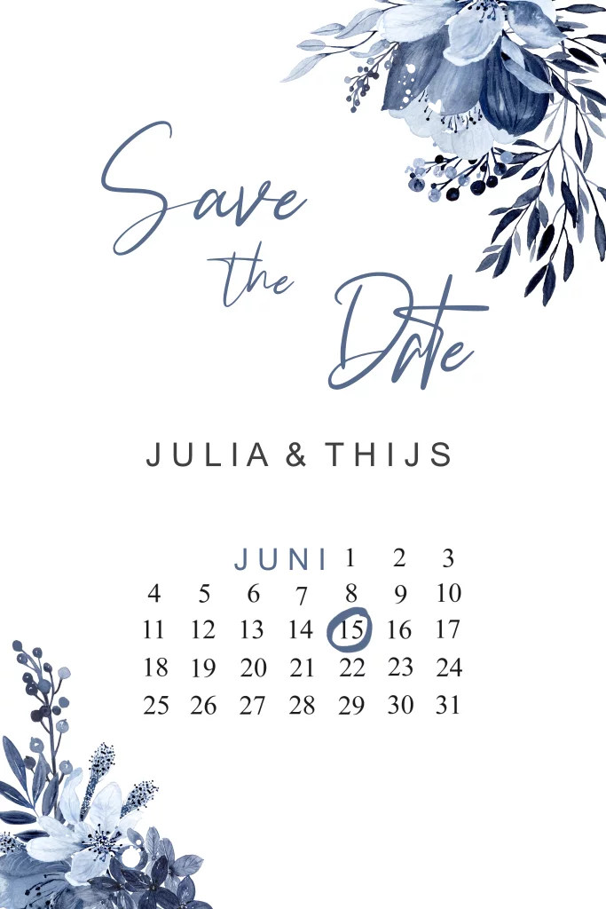 Save the date kaart delftsblauw goudkleurige spetters met kalender