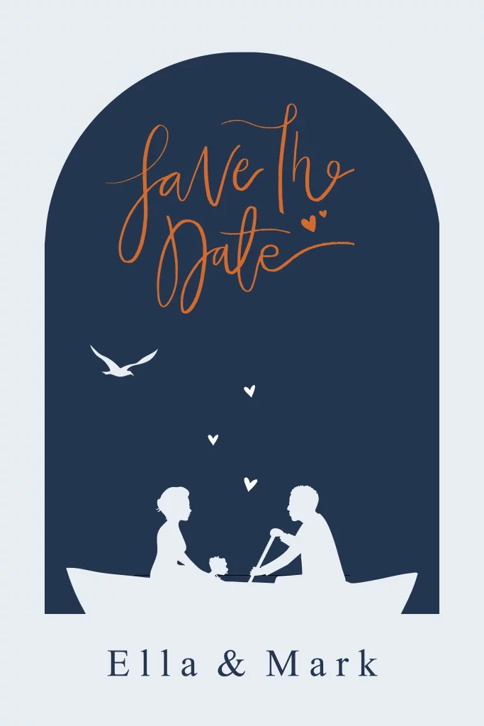 Save the Date bruidspaar met bootje silhouette en boog in donkerblauw. Zoek je een passende trouwkaart, deze staat ook in de collectie.