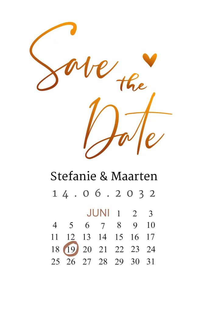 Save-the-date kaart koperlook met de tekst in koperkleur en leuke kalender. Pas de kaart heel makkelijk aan in de editor.