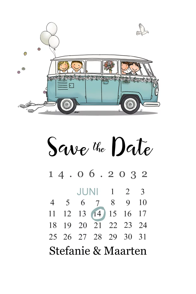 Save the date vwbusjeblauw met bruidspaar. Deze kaart is makkelijk aan te passen in editor. Je kunt kiezen uit verschillende bruidsparen en auto's. Zo stel je zelf je eigen Save the Date kaart samen.