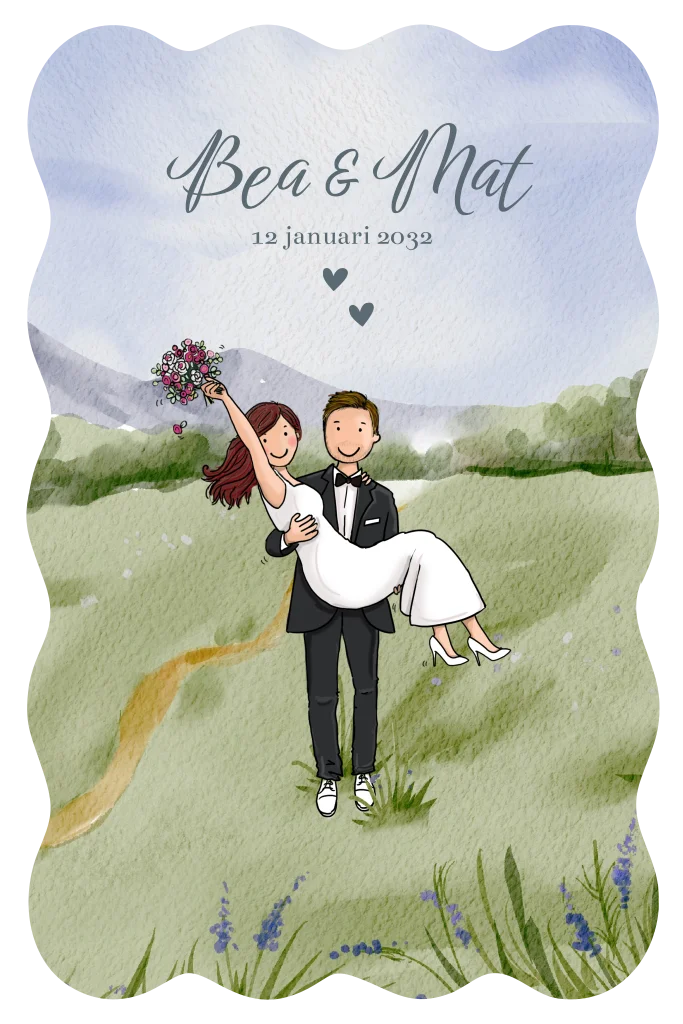 SavetheDate golfrand landschap met bruidspaar