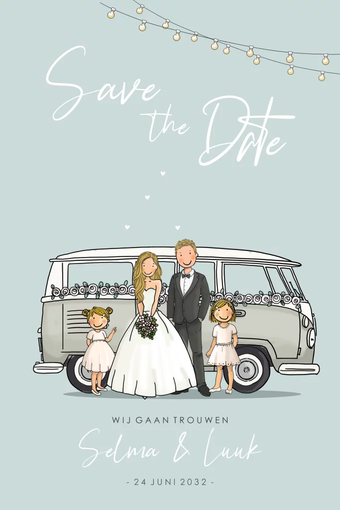 Savethedate vw busje met bruidspaar en kinderen is een vrolijke kaart met leuke hartjes en lichtjes er ook bij. Deze savethedate kaart is compleet aanpasbaar en hoort bij de huisstijl van de trouwkaart vw busje met bruidspaar en kinderen.