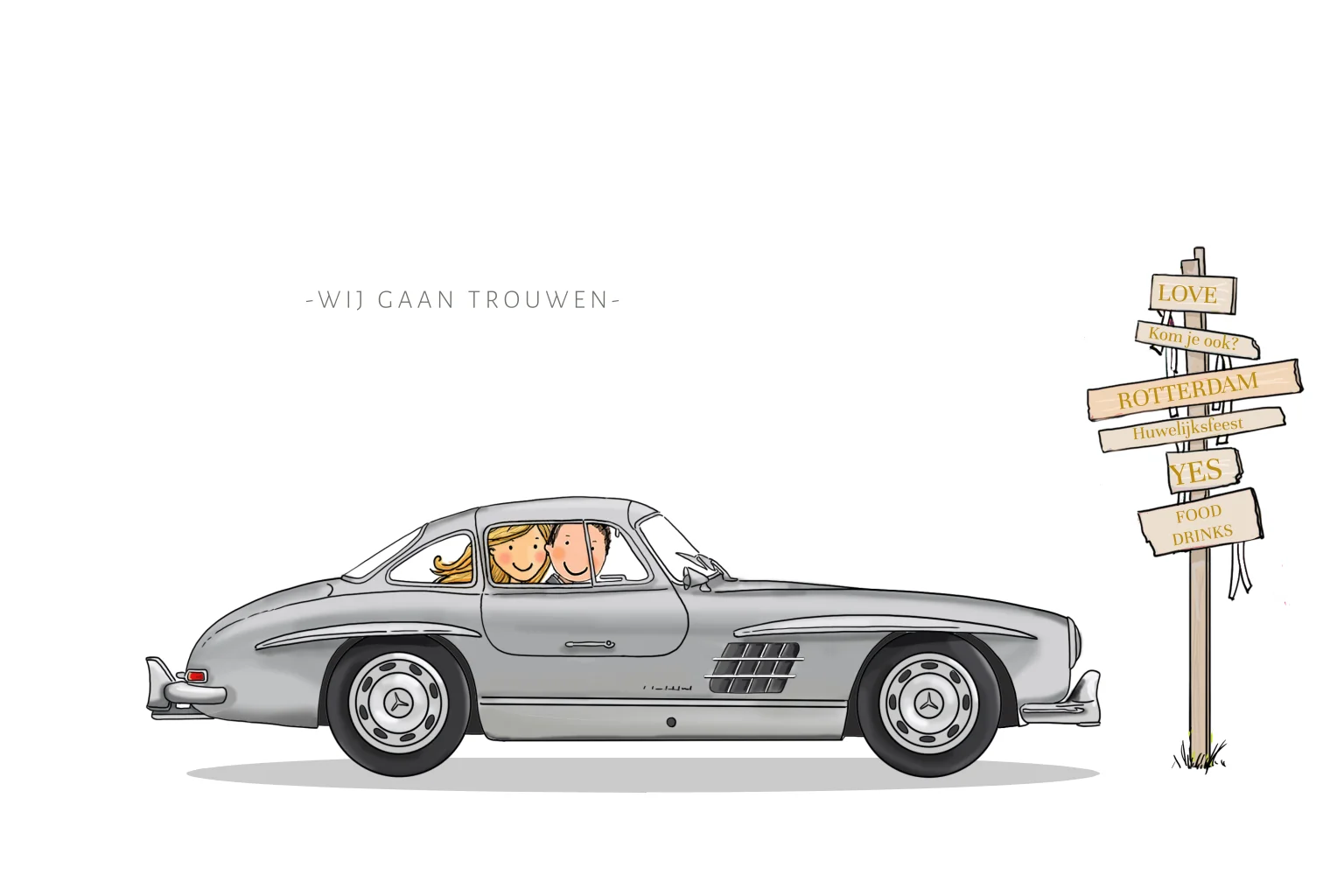Trouwkaart bruidspaar grijze Mercedes 300 SL Gullwing, in onze clipart staan veel leuke illustraties met bruidsparen en kinderen zodat je naar wens deze kunt aanpassen.
