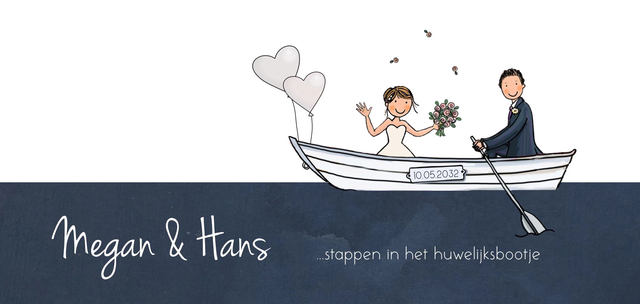 Trouwkaart huwelijksbootje wit met bruidspaar, ballonnen en bloemen. Mooie donkerblauwe rand in watercolor look. De binnenkant heeft een mooie tijdlijn.
