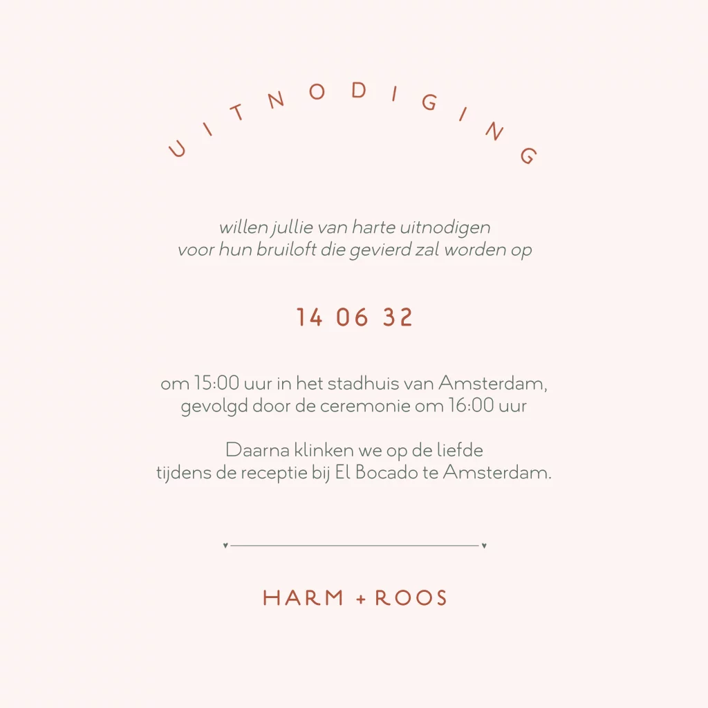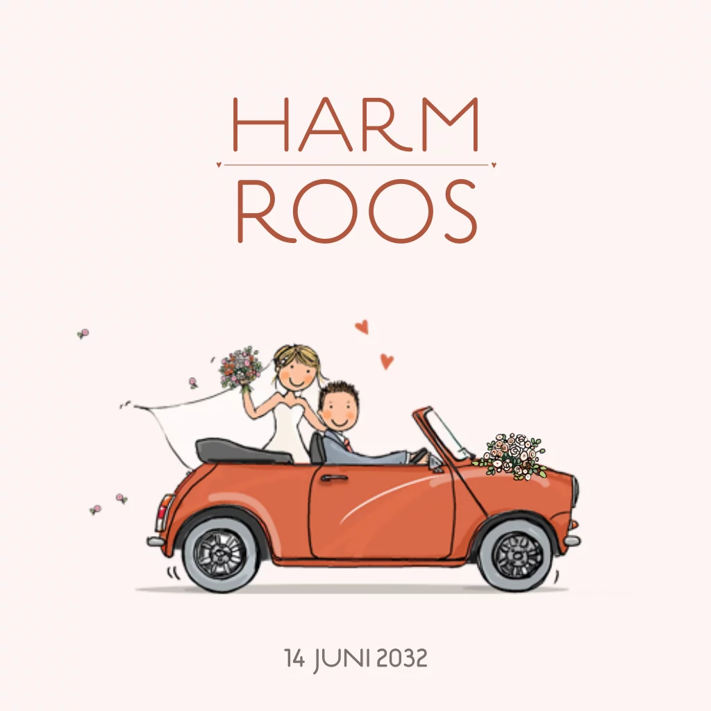 Trouwkaart auto auto mini rood met bruidspaar groene achtergrond, minimalistische en rustige trouwkaart met een strakke layout. De perfecte kaart voor een bruiloft.