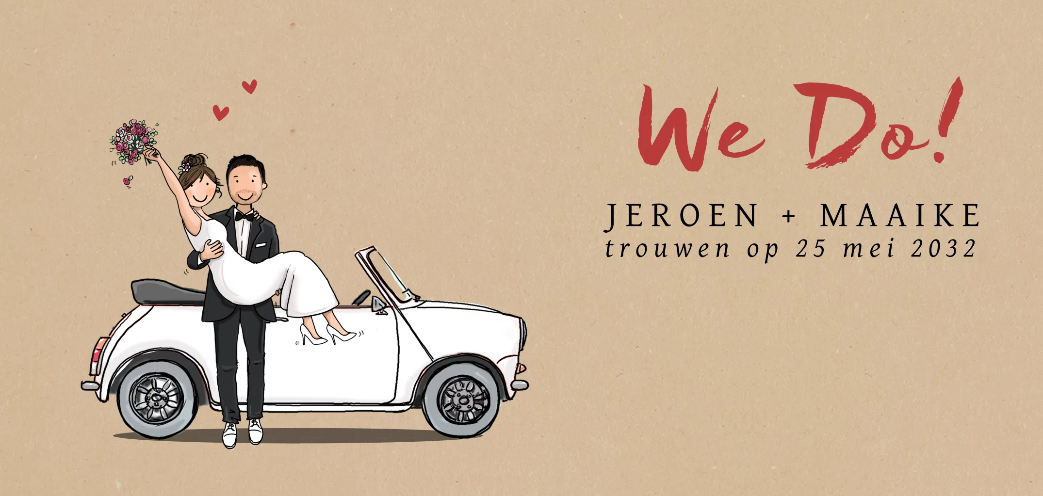 Trouwkaart auto mini wit bruidspaar kraftlook, teksten zijn naar wens aanpasbaar. De auto kun je vervangen door een fiat, volkswagen, citroen etc. In de clipart staan veel leuke auto's klaar. Binnenkant heeft links een mooie tijdlijn die je naar wens kunt aanpassen. Veel plezier ermee.